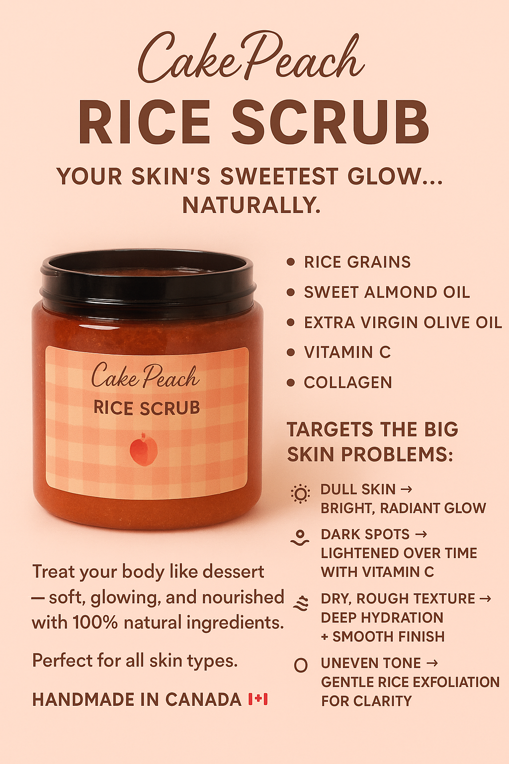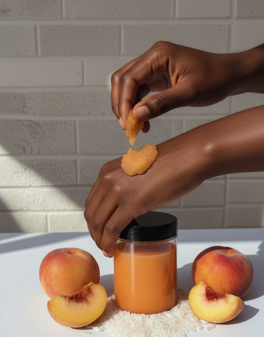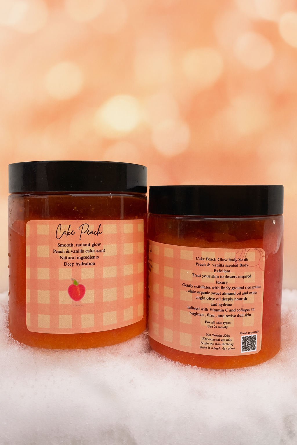 cake peach body scrub, dessert-inspired skincare, exfoliating body polish, collagen scrub, vitamin C scrub, hydrating body exfoliant, peach vanilla scrub, glowing skin scrub, natural handmade body scrub, cruelty-free exfoliator.
